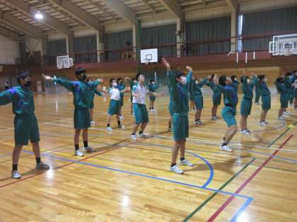 保健体育の授業です。 今日は、ダンスの発表会です。 まずは、W-UPです。