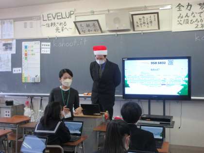 英語の授業です。 ALTのレイ先生と、クリスマスクイズです。