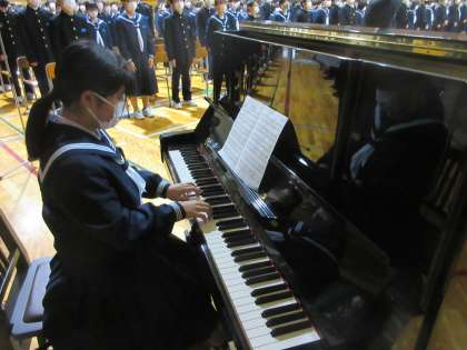 式辞のあと、感染対策として、校歌は演奏のみを行い、心の中で1題目だけを歌いました。
