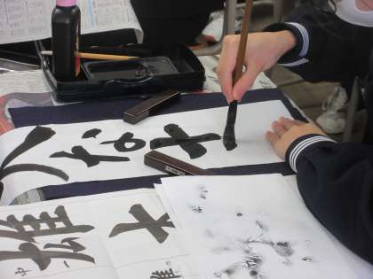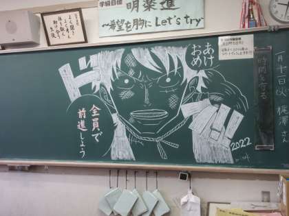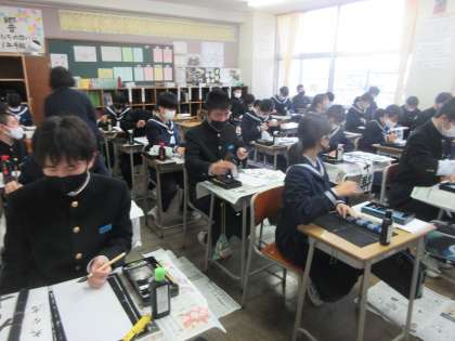 集中しています!! 黒板には、担任からのアートメッセージが!!