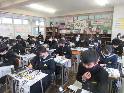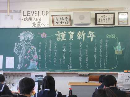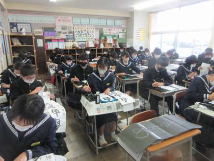 2年生は、「自由創造」を書きます。 黒板には、担任からの熱い思いが・・・。