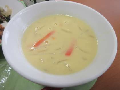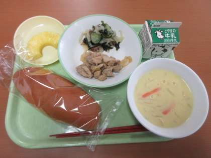 野菜ポタージュは野菜の甘みがたっぷり!! コッペパン 牛乳 あっさりチキン 海藻サラダ 野菜ポタージュ カットパイン