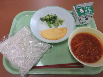 人気メニュー、ソフト麺!!今日は、ミートソースで!! ソフト麺 牛乳 ミートソース オムレツ 花野菜サラダ