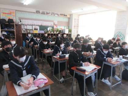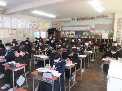 国語の授業です。 「少年の日の思い出」を学習しました。 「登場人物は?」 「クジャクヤママユ!」「それは、蝶ね・・・。」