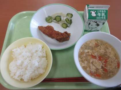 かき玉汁が具だくさんで、とってもヘルシー!! ごはん 牛乳 魚の利久揚げ レモン和え 中華かき玉汁