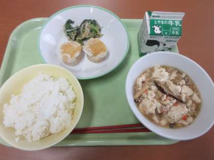好き嫌いせず、しっかり食べて、免疫力を高めましょう!! ごはん 牛乳 マーボー豆腐 にんじんシューマイ おひたし