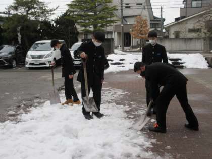 玄関の中では掃除、外では雪割りのボランティアです。 ありがとう!