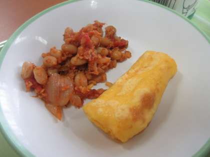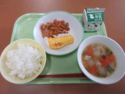 いくつもの野菜のうまみが溶け出し、大爆発!! ごはん 牛乳 卵ロール 白いんげん豆のトマト煮 野菜のスープ煮