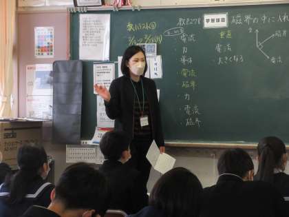 理科の授業です。 磁界の中に入れたコイルに、電流を流すとコイルはどうなるのかを学習しました。