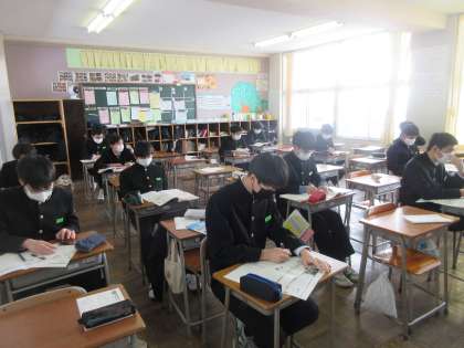 保健体育の授業です。 男子は、保健の授業で、健康を守る社会の取組を学習しました。