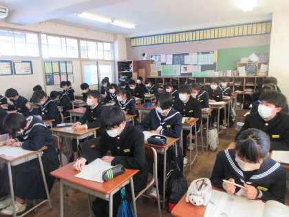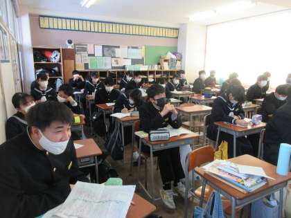 社会の授業です。 学年末評価の解説です。 「そうかぁ、この問題、確かに授業でやったよなぁ・・・。」