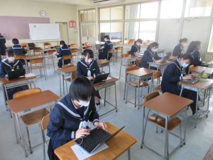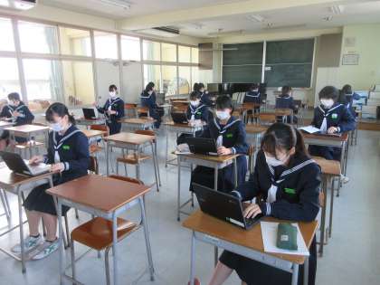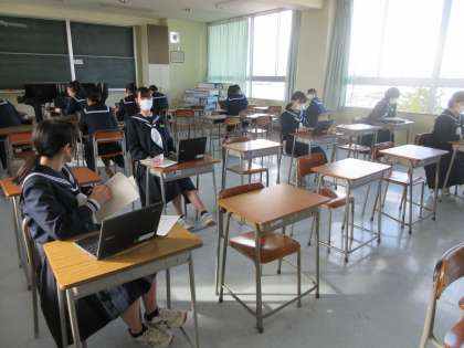 女子は、クロムブックを使って、音程の確認です。 「うわぁ〜、ここ難しそう!!」