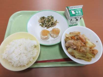 キャベツの甘さとタケノコの食感が、抜群の回鍋肉です。 ごはん 牛乳 回鍋肉 にんじんシューマイ 茎わかめのごま和え
