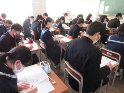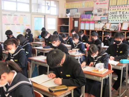 数学の授業です。 プリントを使って、箱ひげ図の復習をしました。
