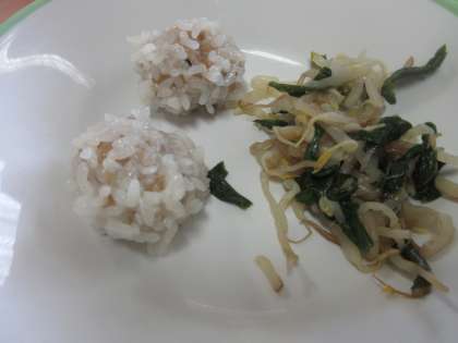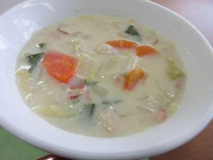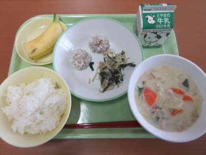 野菜たっぷりの中華クリーム煮です。 ごはん 牛乳 白菜の中華クリーム煮 珍珠団子 もやしとニラのソテー バナナ