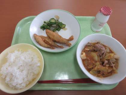 ボルシチのキャベツが最高においしい!! ごはん 飲むヨーグルト ボルシチ こんにゃくサラダ わかさぎのフリッター