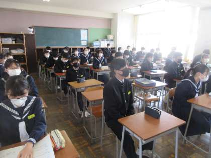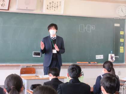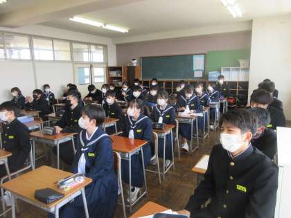 学活の時間です。 担任の話に集中しています。