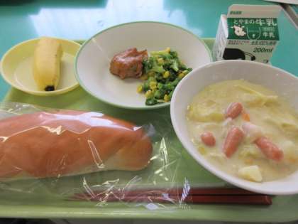 今日の給食 公開日 2022/04/11 更新日 2022/04/11 給食 本日より、1年生も給食スタートです。 モリモリ食べて、丈夫な体をつくりましょう!! 米粉コッペパン 牛乳 照焼きチキン イタリアンサラダ 春キャベツのクリームシチュー バナナ