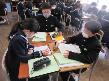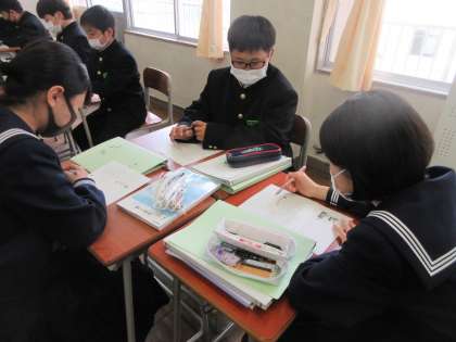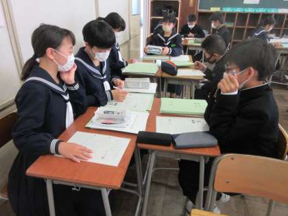 中1学力調査の解説です。まずは、間違えやすい問題を、もう一度グループで考えました。