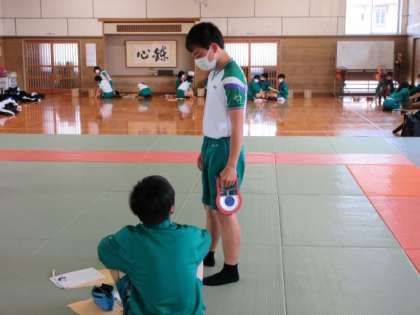 保健体育では、新体力テストをしています。「あと少し!」この最後の粘りが大切です。昨年度より、記録は伸びたかな?