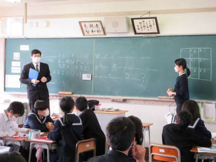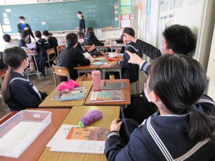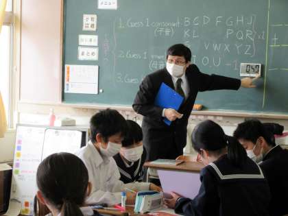 レイ先生との英語の授業。文をつくるのに、子音があるか,グループで考えています。「あれじゃない?」