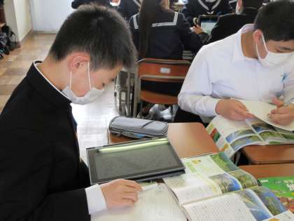 社会は、扇状地の学習です。。クロムブックを使って、地図記号を調べました。