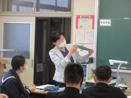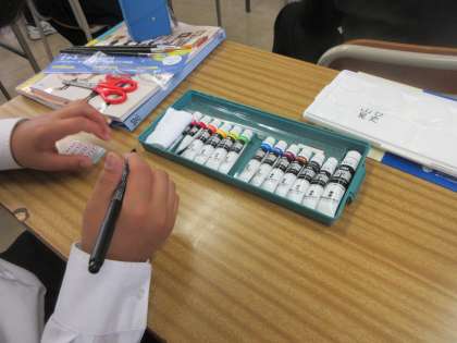 美術の授業です。 ポスターカラーを配布しました。一つ一つに名前を書きます。
