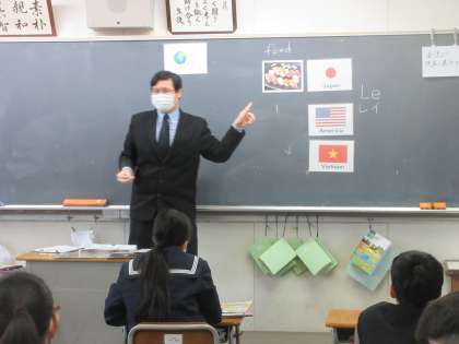 英語の授業です。 ALTのレイ先生と一緒に学習しました。