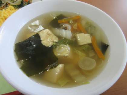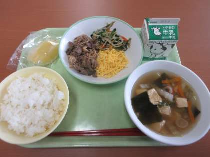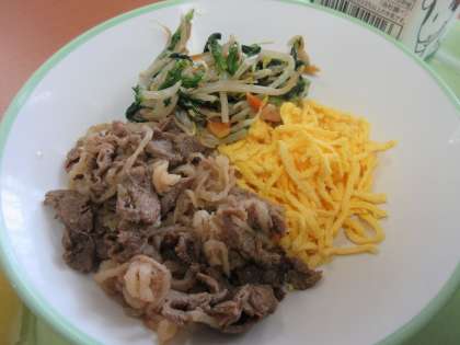 ビビンバ丼、安定のおいしさ!! ごはん 牛乳 錦糸卵 ナムル 焼き肉 中華スープ 冷凍リンゴ