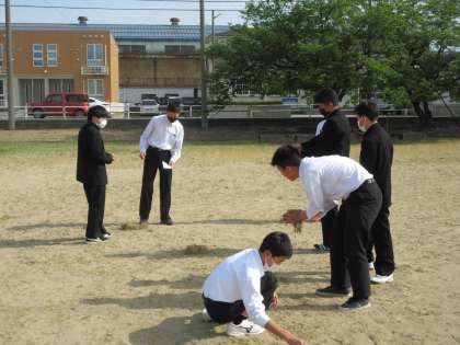 グラウンドの草むしりをするボランティア活動が行われています。