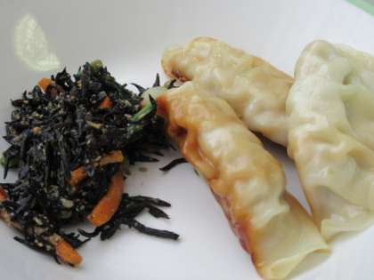 本日は中華風メニュー!!ご飯が進みます。 ごはん 牛乳 えびと豆腐のうま煮 焼きぎょうざ ひじきのごま和え