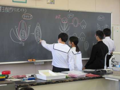 1−1 公開日 2022/05/19 更新日 2022/05/19 第1学年 理科は、被子植物と裸子植物を比べる学習です。「おしべやめしべはどこだろう?」「胚珠はどの部分?」について、個人ワークシートを基に班でまとめました。