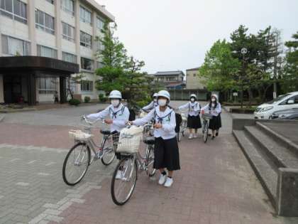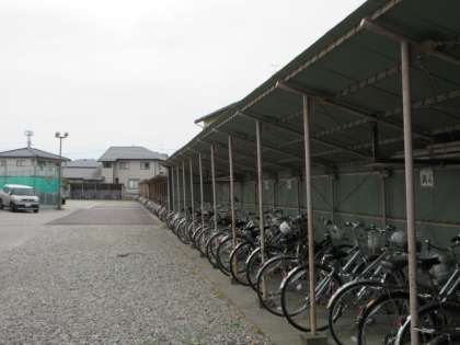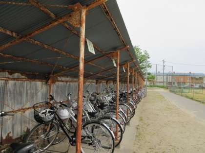 敷地内では、自転車は手で押して移動します。 自転車小屋も、きれいに整頓されています。
