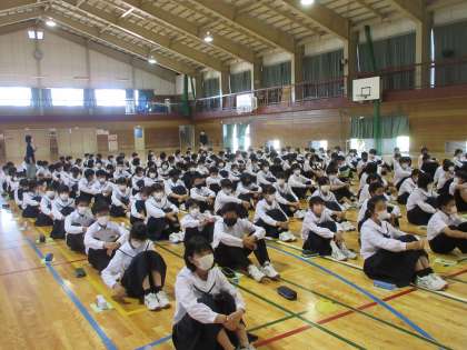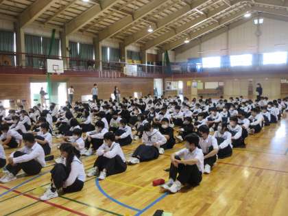 明日の校外学習に向けて、1年生が結団式を行いました。