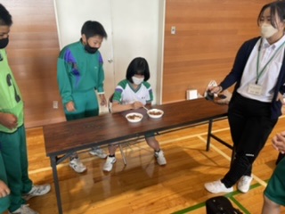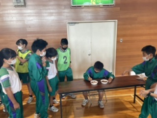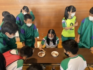 50個のどんぐりを箸でつまんで隣の皿に移します。