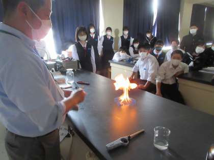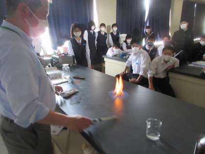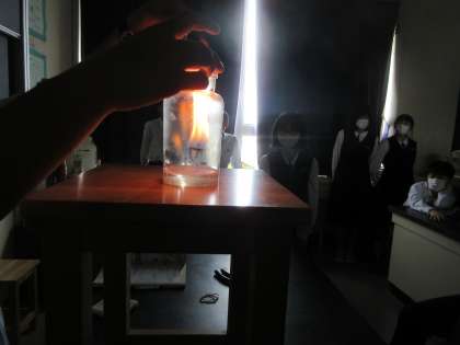 理科の授業です。 ものが燃えるとはどのようなことかを考えました。 エタノールに火を付けます。 「おっお〜〜!!」