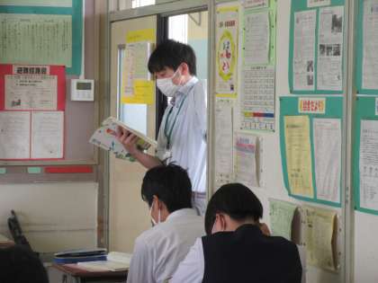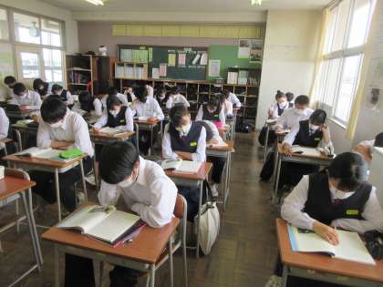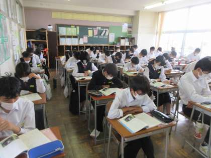 国語の授業です。 「作られた『物語』を超えて」の学習です。範読を聞きます。