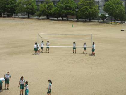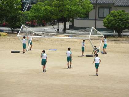 保健体育の授業です。 サッカーです。自分たちでゴールを運んで準備します。