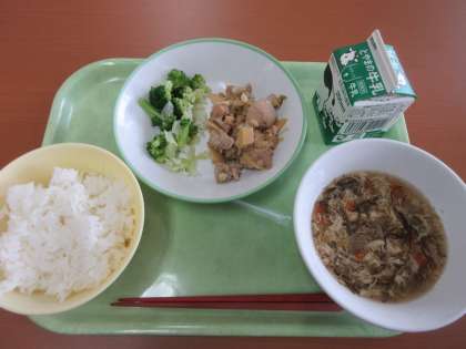 スープに入れられた、もずくのツルツル感が最高です!! ごはん 牛乳 あっさりチキン そえ野菜 卵ともずくのスープ