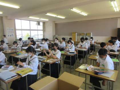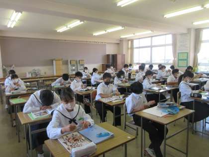 美術の授業です。 配色カードを使って配色計画を立てました。
