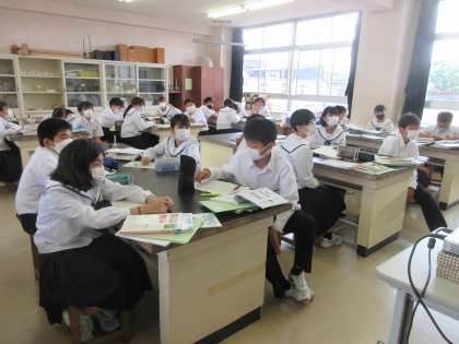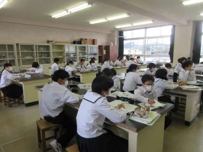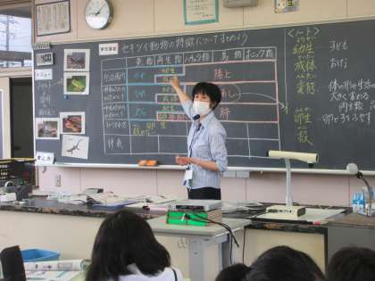 1−5(その2) 公開日 2022/06/03 更新日 2022/06/03 第1学年 「鳥類とハチュウ類の卵には殻があって、魚類と両生類の卵には、なぜ殻がないのでしょうか!?」 「敵から守るためかなぁ・・・。」 「温度調節のためかなぁ・・・。」 「乾燥から守るためじゃない。」「正解!!」