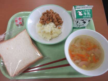 今日の給食 公開日 2022/06/06 更新日 2022/06/06 給食 キャベツスープは、ソーセージと野菜のうまみが爆発しています!! 食パン 牛乳 チリコンカン キャベツスープ こふきいも ポケットチーズ