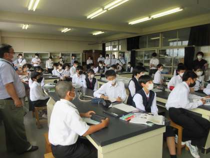 研究授業(2−1) 公開日 2022/06/06 更新日 2022/06/06 第2学年 2−1で、中教研の研究授業を行いました。富山市の理科の先生方がたくさん来校され、「空気中や二酸化炭素中で、マグネシウムを燃焼させると、どのような変化が見られるだろうか。」という授業を行いました。