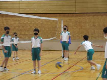 2−3 公開日 2022/06/08 更新日 2022/06/08 第2学年 体育は、バレーボールです。スパイク練習をしました。トスも難しい・・・。「ここで、打つんだよ。」踏み込んで、振りかぶって!ゲーム中にも決まるといいね。