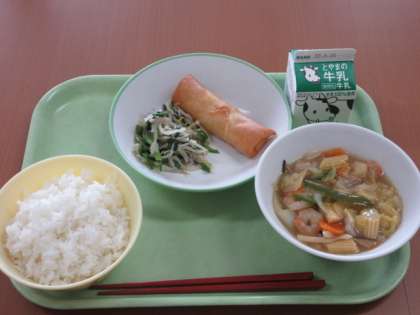 今日の給食 公開日 2022/06/08 更新日 2022/06/08 給食 中華メニューです。八宝菜のヤングコーンと筍、塩ナムルのもやしのシャキシャキ具合、すべての食感がグッド!春巻きは皮がぱりぱり、中身がジューシー、安定のおいしさです。 ごはん 牛乳 春巻き 塩ナムル 八宝菜