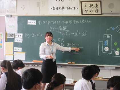 教育実習生が、電池の中で起きている化学変化の授業を行いました。