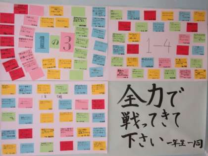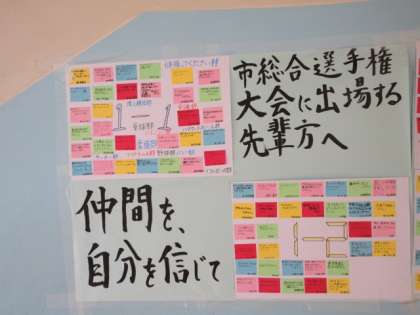 1年生にとって、初めての市総合選手権大会です。試合に出る先輩方に応援メッセージを送ります。この応援の力もプラスにして、日頃の練習の成果を出せるよう応援しています。頑張れ!北中生!