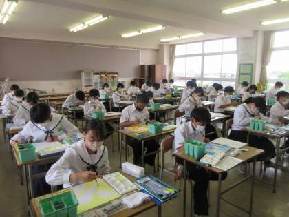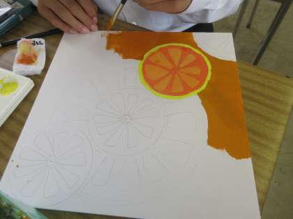 美術の授業です。 野菜や果物を使って、新しい形をデザインします。