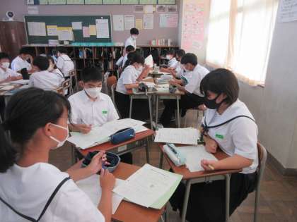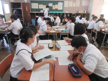 理科の授業です。 グループで期末評価の問題を解き直しました。 「な〜んだ、そうやって考えればよかったんだぁ・・・。」