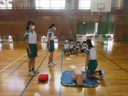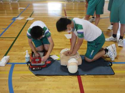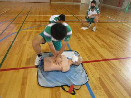 救命講習「心肺蘇生法」(2−1・2−2)その3 公開日 2022/06/28 更新日 2022/06/28 第2学年 「大丈夫ですか!?」 「あなたは119番通報をお願いします。あなたは、AEDを持ってきてください。」